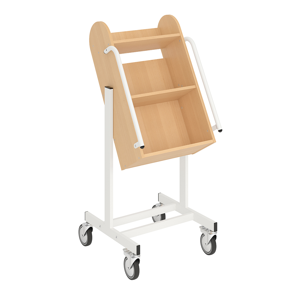 De vorm van de boekenwagen zorgt voor een veilige opslag van media en biedt daarnaast een goed overzicht van de boeken die erop liggen. Verhoogde opslag vermindert slijtage aan de rug en gewrichten.