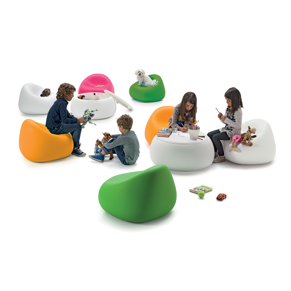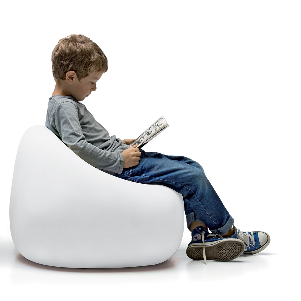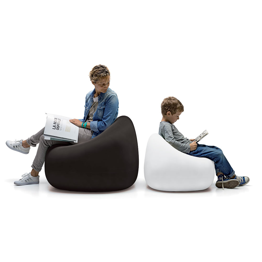 De Gumball-fauteuil heeft de vorm van een zachte, reeds “ingedeukte” zitzak en biedt de perfecte plek om te zitten met vrienden of met een goed boek.