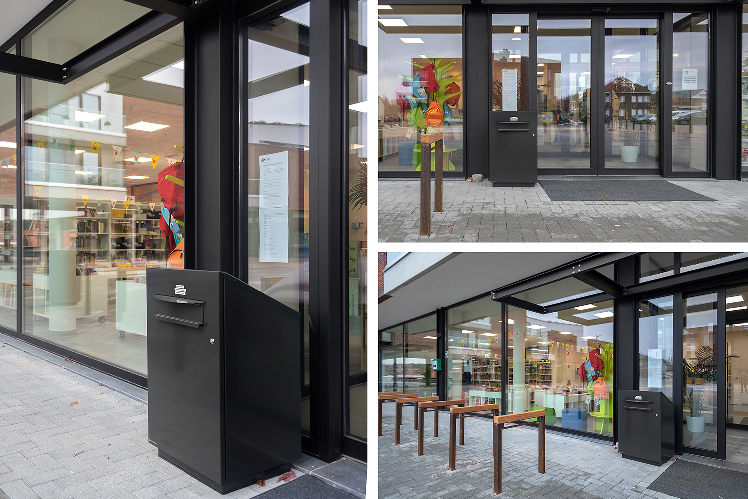 Robuuste, afsluitbare metalen inleverbox voor gebruik buitenshuis. Geschikt voor bibliotheken met beperkte openingstijden.