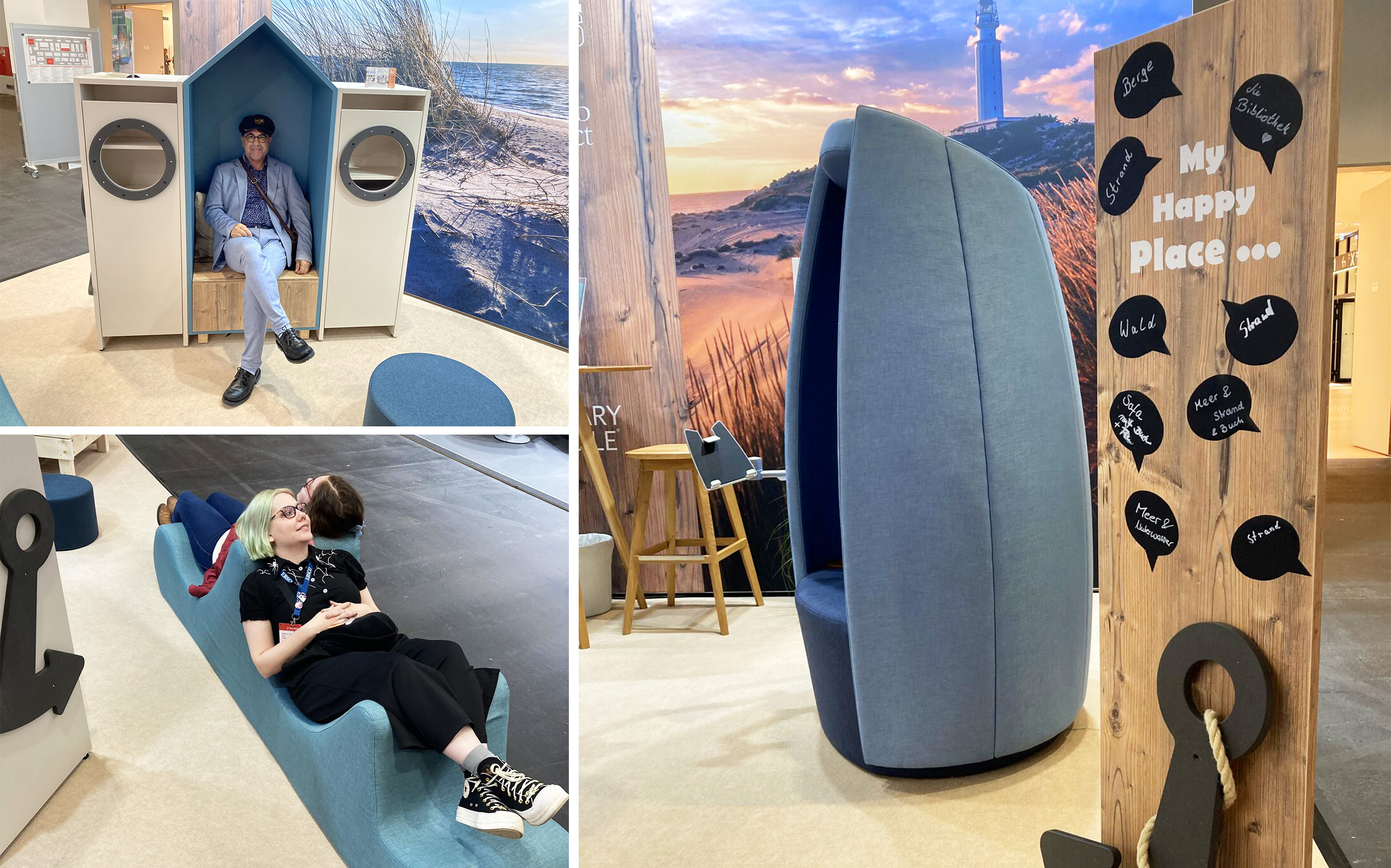 We vroegen onze gasten om hun geluksplekje op een zwarte tekstballon te schrijven en deze op een moodboard te plaatsen. Geïnspireerd door de stand en de natuurelementen schreven ze plekken op die ze associëren met ontspanning en welzijn. Ze noemden plaatsen als het strand, de zee, bossen en bergen.