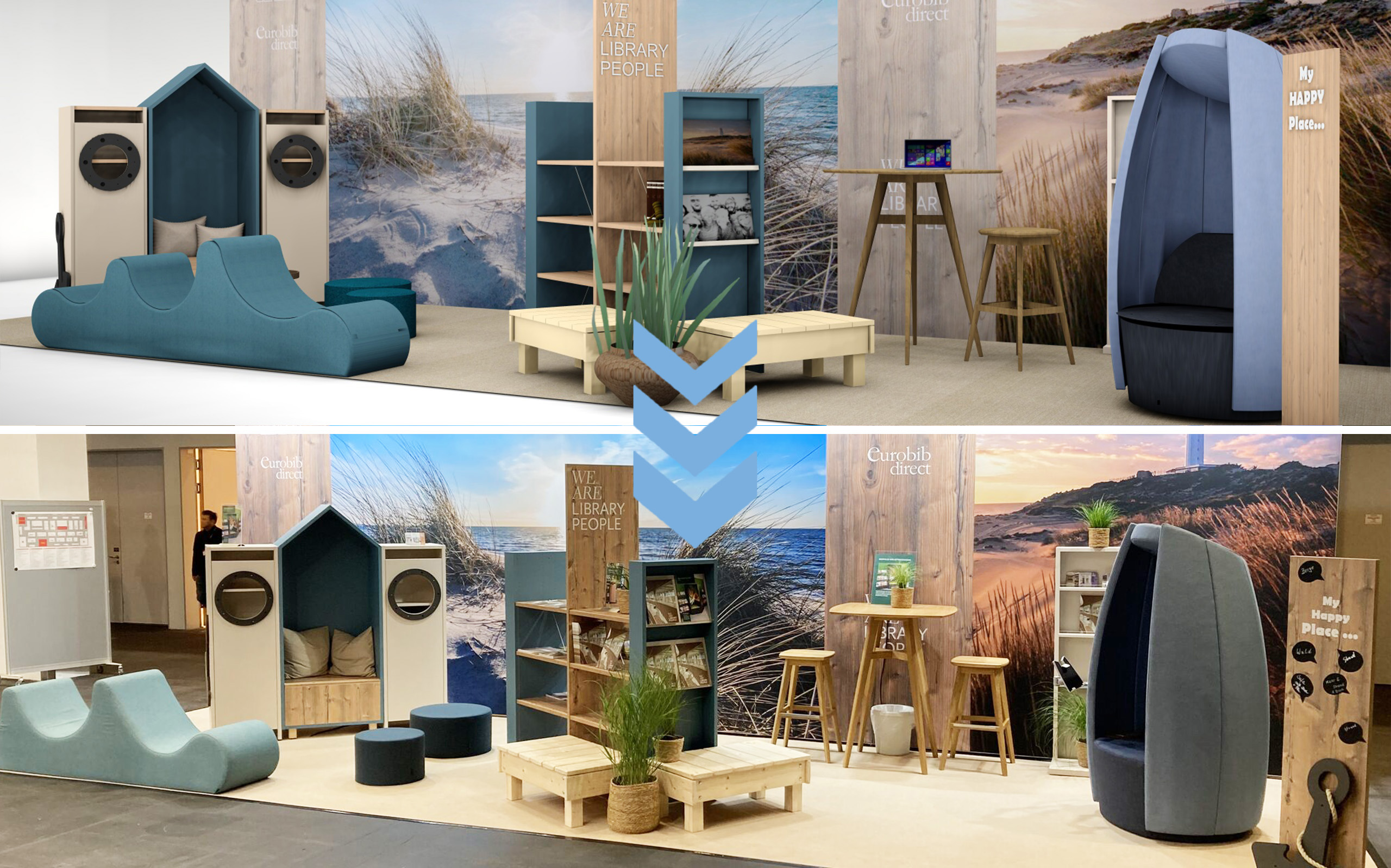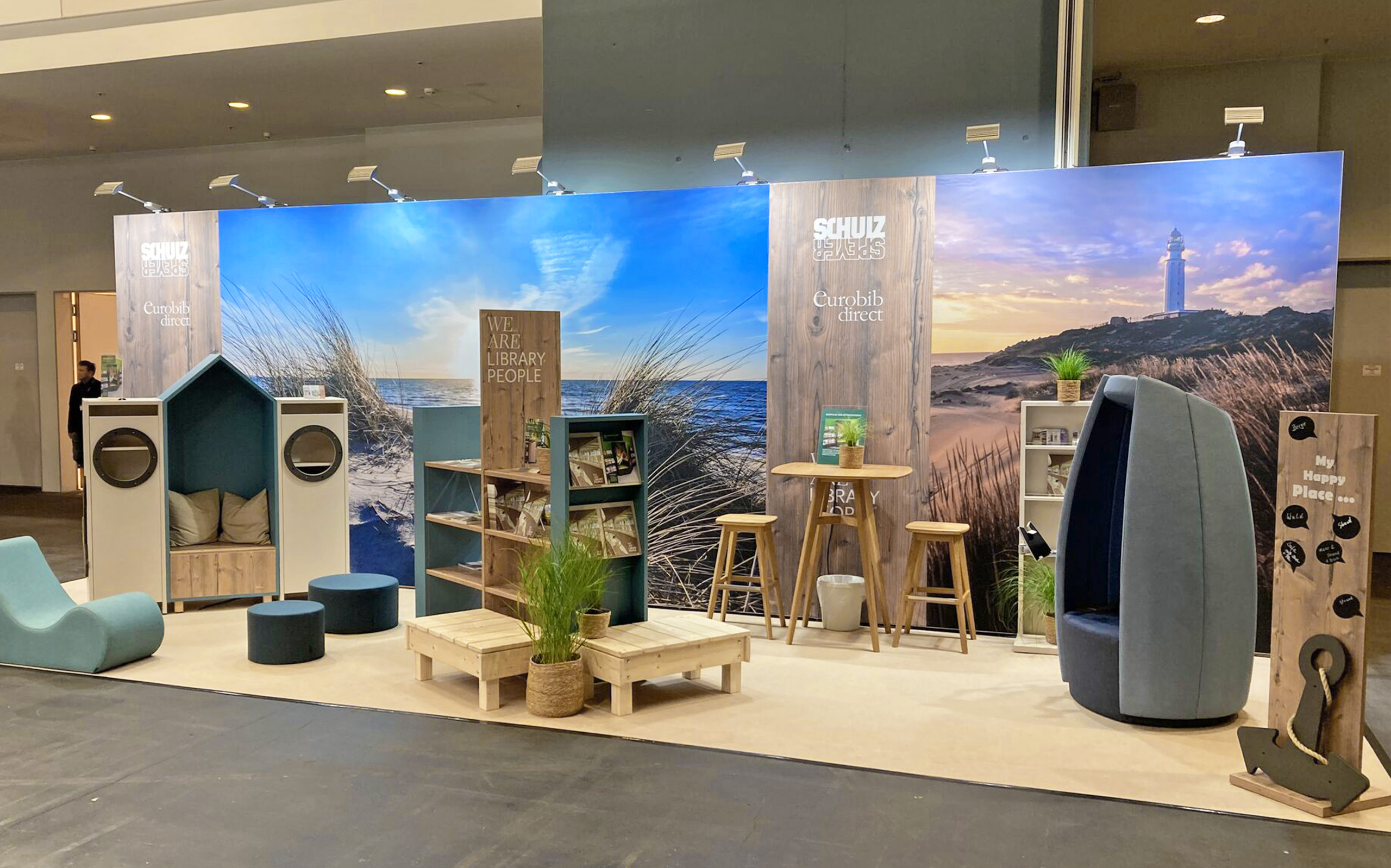 Toen we ons verdiepten in de details van het ontwerp van onze stand, verschoof onze aandacht naar het vertalen van onze visie in tastbare elementen die de zintuigen en de verbeelding prikkelen. We moesten ons ook houden aan het economische kader van de tentoonstelling, net zoals onze ontwerpprojecten zijn gebonden aan een specifiek budget. Met het biofiele bibliotheekontwerp als leidraad en de serene schoonheid van het strand en de Noorse kust als inspiratiebron, hadden we verschillende pijlers uitgekozen die tegemoet kwamen aan de uiteenlopende behoeften en interesses van onze bezoekers.