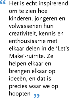 “Het ging om een moeilijk in te richten ruimte met vreemde hoeken, waar heel wat materiaal een plaatsje moest krijgen. We wilden de nieuwe ‘Let’s Make’-ruimte een hightechuitstraling geven, zonder in een futuristische look te vervallen. Thedesignconcept ltd. bracht die uitdaging tot een goed einde. Het resultaat is aantrekkelijk, functioneel, gebruiksvriendelijk en vernieuwend.”