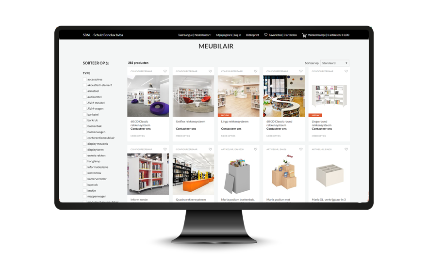 Precies zoals in de bib, met verschillende afdelingen voor elke behoefte, vindt u de bestsellers op onze website in verschillende zones en thema’s. Zo vindt u onder “inkomzone” presentatiemeubilair, balies, kapstokken en inleverboxen.