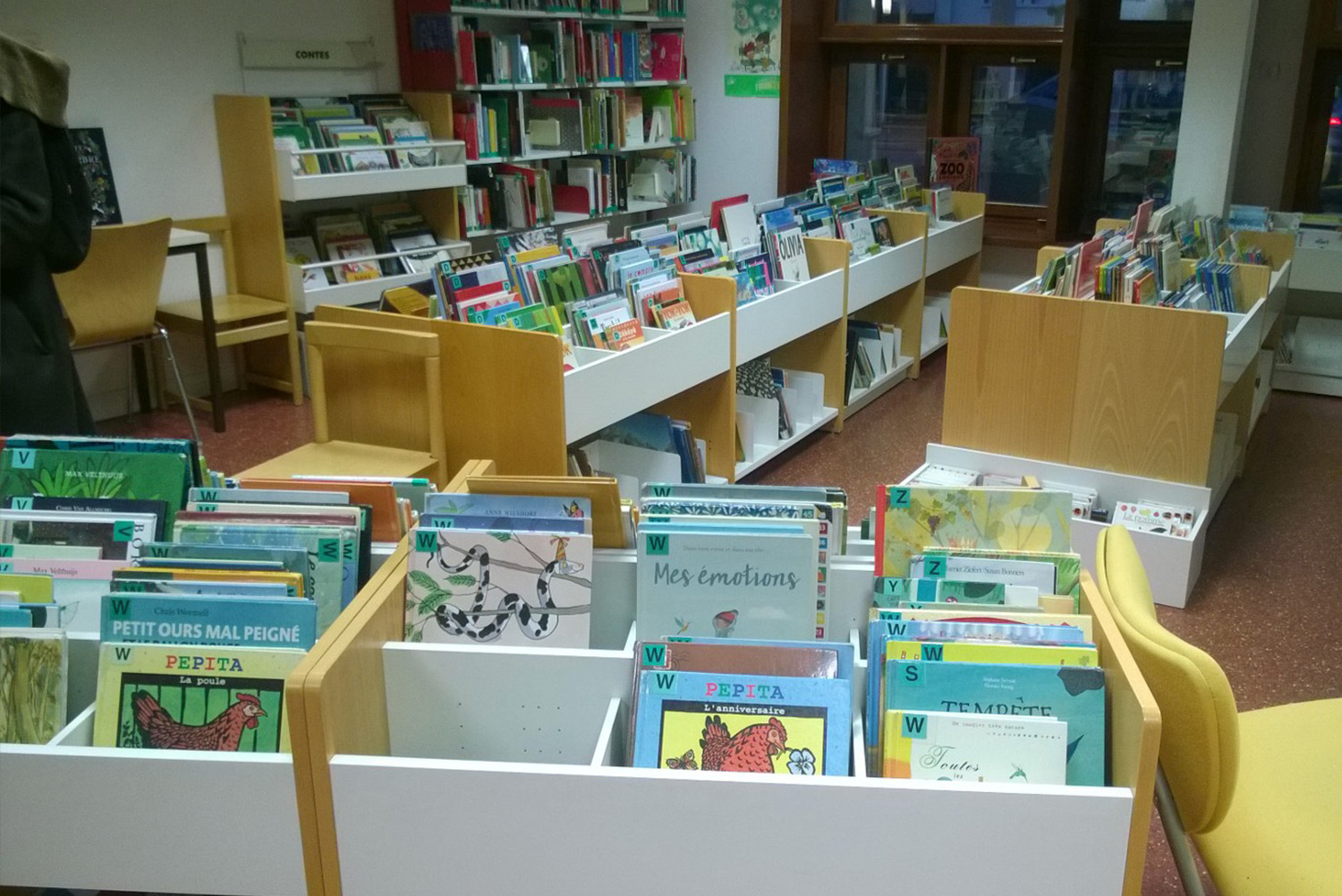 De onderste delen van de boekenbakken werden bovendien voorzien van een uitschuifbaar deel, zodat grote prentenboeken gemakkelijker te vinden zijn.