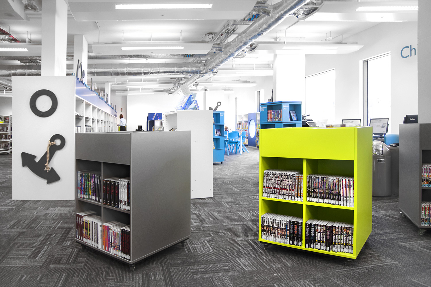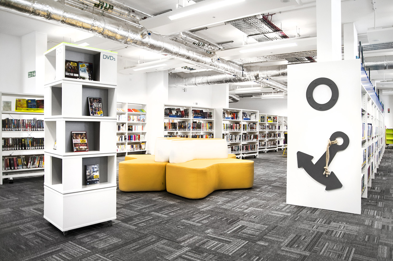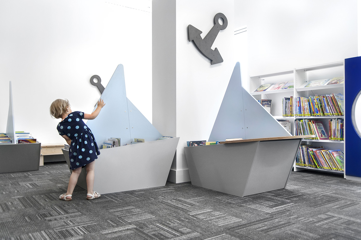 Boekenbakken in bootvorm en rekken voorzien van golven, ankers en patrijspoorten prikkelen in de kinderafdeling de verbeelding en geven gestalte aan een maritiem thema – een knipoog naar het rijke verleden van Greenwich. Ook voor de jonge bezoekers zijn overigens pc’s en tablets voorzien.