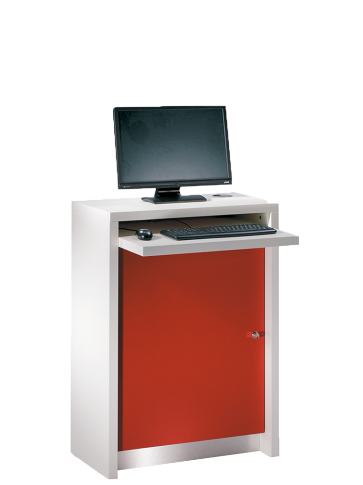 In het werkblad van de balie is een kabeldoorvoer voorzien. Er kan ook een CPU- of laptophouder worden geïnstalleerd.
