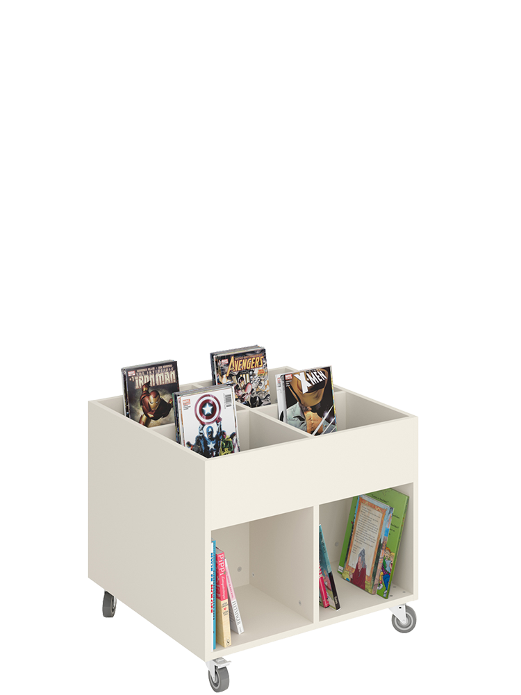 Een functionele en moderne boekenbak die in elke zone van de bib past, maar vooral geschikt is voor de kinderhoek.