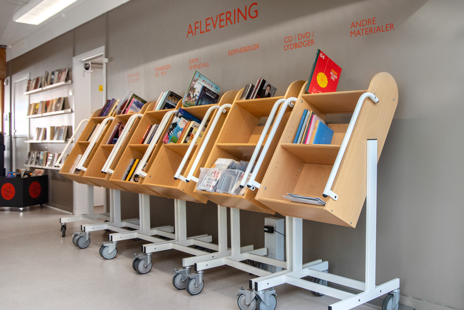 Gebruik de boekenwagens om ingeleverde boeken moeiteloos weer naar de rekken te brengen.
