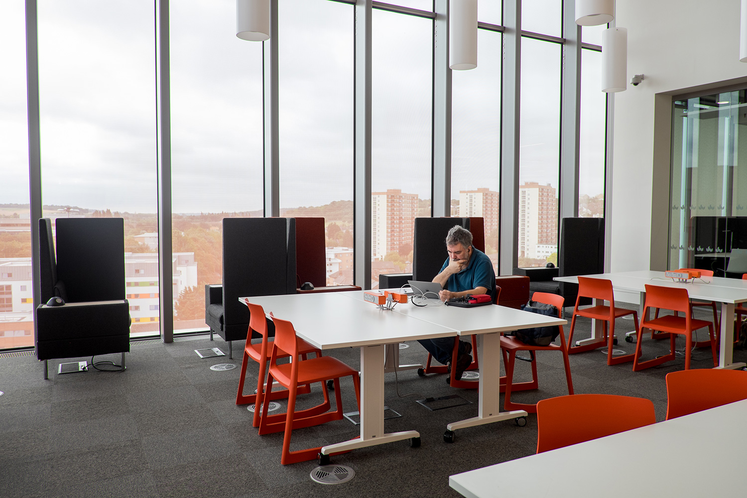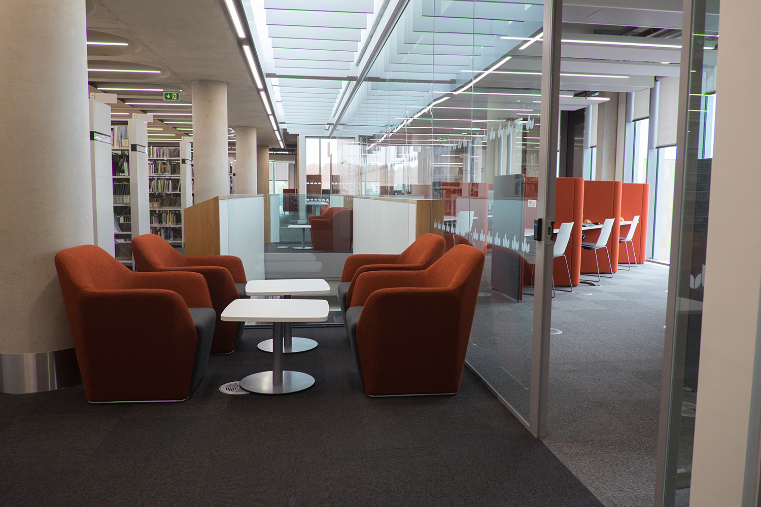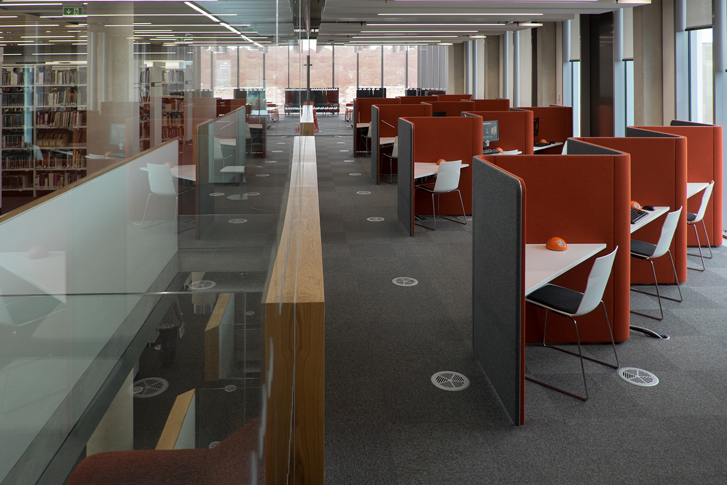 Op verschillende plaatsen in de bibliotheek zijn hokjes te vinden in verschillende kleuren. De hoge rugleuningen van de armstoelen met geïntegreerd werkblad dempen de omgevingsgeluiden. Dankzij Pluto stopcontacten met dubbele USB-aansluiting kunnen de studenten dan weer zorgeloos aan de slag op hun laptops. Ronde vijfpersoonstafels met geïntegreerde computerschermen die automatisch op-en-neer bewegen, kunnen indien nodig voldoende vrij werkoppervlak bieden. Ook de toetsenborden, computermuizen en kabels kunnen netjes worden opgeborgen. De studeerhokjes scheppen een mooi contrast met de bestaande rekkensystemen en vullen de universiteitsbibliotheek met kleurrijke accenten, met een moderne look als resultaat.