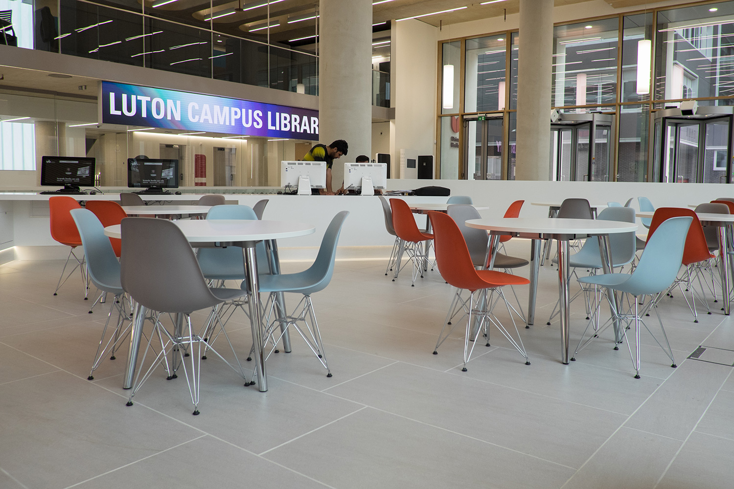 De sobere stoelen met verchroomd onderstel in de cafetariahoek van de receptie kregen verscheidene kleuren, afgestemd op het bibliotheekinterieur. Verspreid over de bibliotheek vinden de studenten ook stoelen met slede-onderstel, terwijl een kantelbare versie twee zitposities mogelijk maakt voor maximaal comfort en voldoende ondersteuning. Stapelbare stoelen met gestoffeerde zitkussens kunnen moeiteloos worden opgeborgen voor extra ruimte indien gewenst.