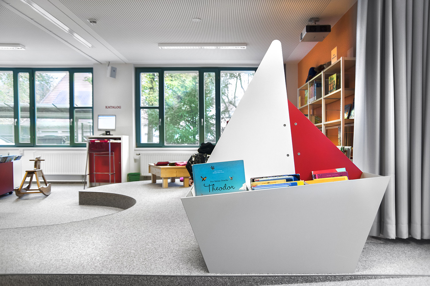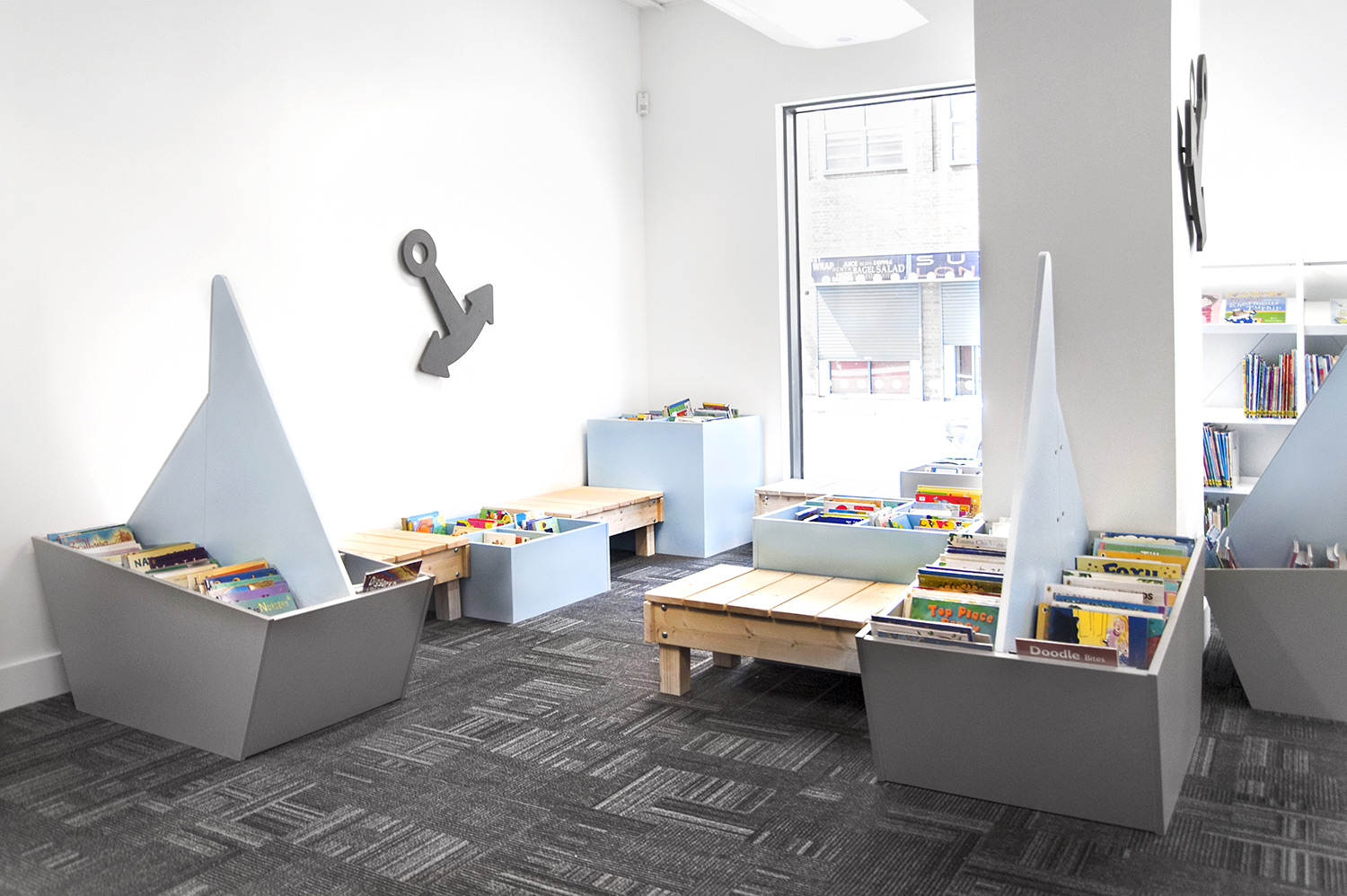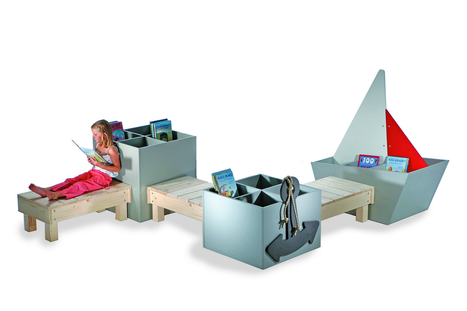 Deze prachtige prentenboekenbakken hebben de vorm van zeilboten. De romp met 6 vakken kan worden gebruikt om boeken te ordenen naar leeftijd, met de vlakke achterzijde het meest geschikt voor de allerkleinsten en de boog voor de oudere kinderen.