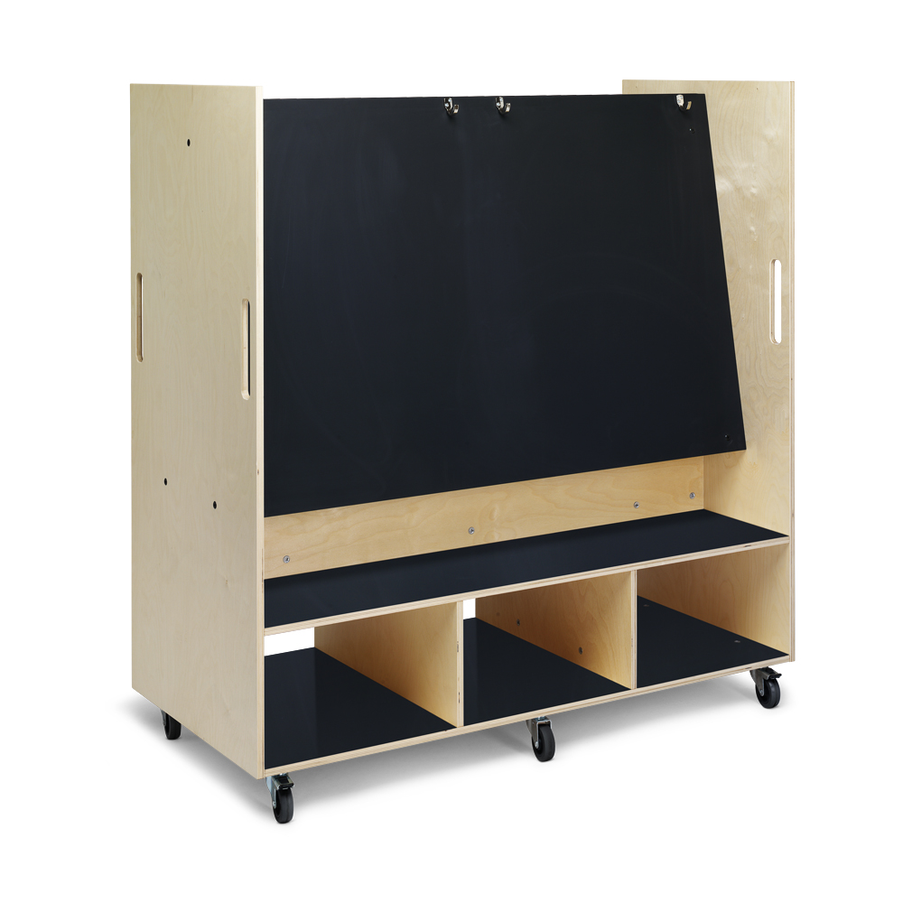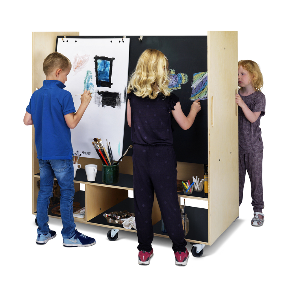 Vrijstaande dubbelzijdige schildersezel op wielen waar tot vier creatieve kinderen tegelijkertijd gebruik van kunnen maken.