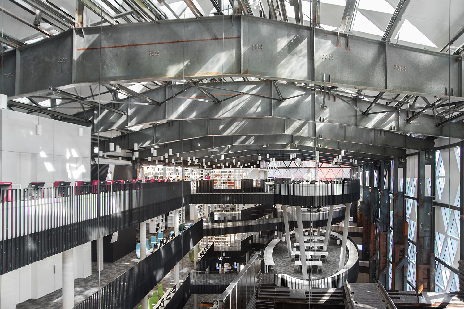 Het indrukwekkende gebouw werd ingepland naast oude staalfabrieken die deels in het gebouw verweven zijn..