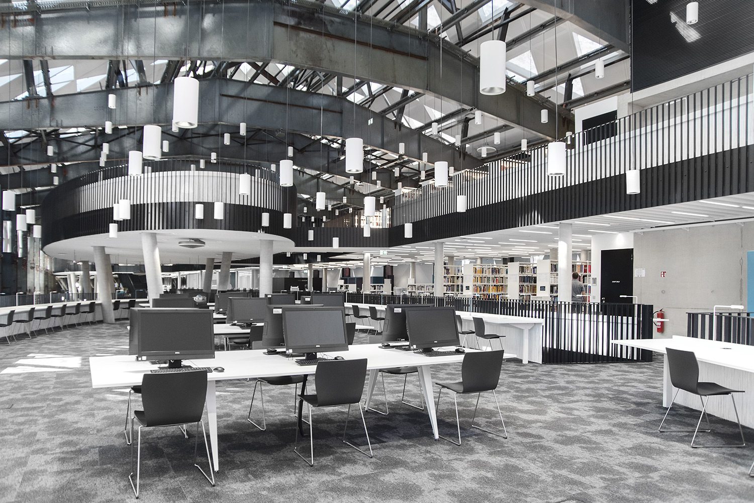 De UNIFLEX bibliotheekrekken met geïntegreerde LED verlichting strekken zich uit over 5 verdiepingen. Goed voor 10.7km aan legborden.