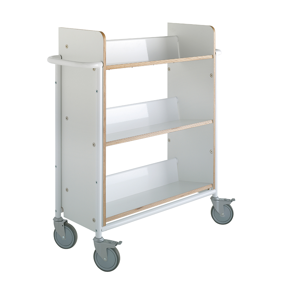 Functionele, enkelzijdige boekenwagen met drie vaste, schuin geplaatste legborden die zorgen voor een veilige media opslag.