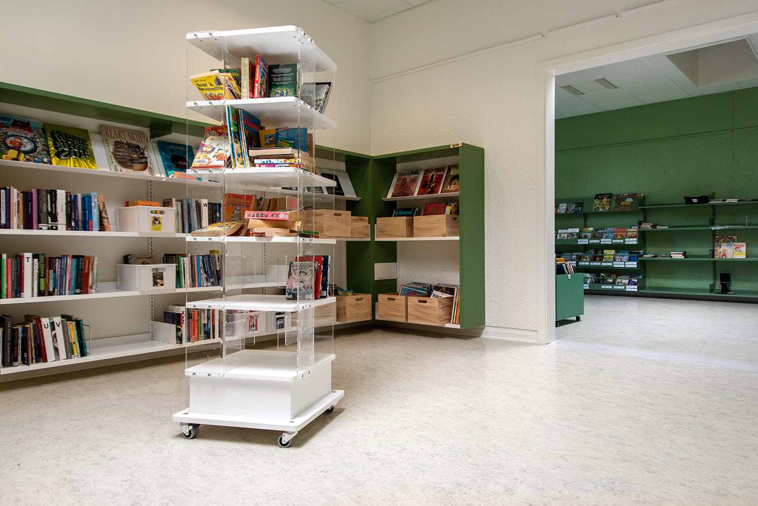 Dankzij de constructie van dit onderstel is de hoogte van de boekentoren met het onderstel eronder gemonteerd en de standaard uitvoering zonder wielen, dezelfde.