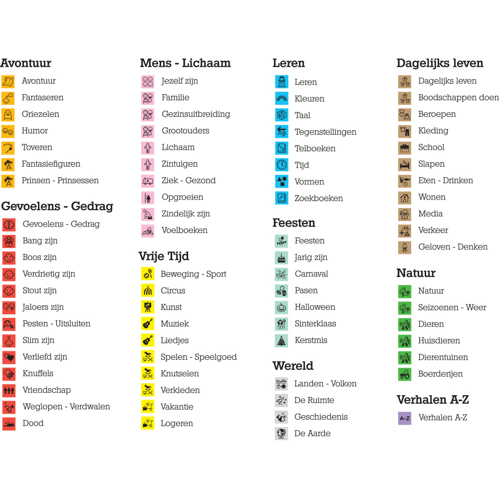 Met de verschillende rubrieken, pictogrammen en kleuren.