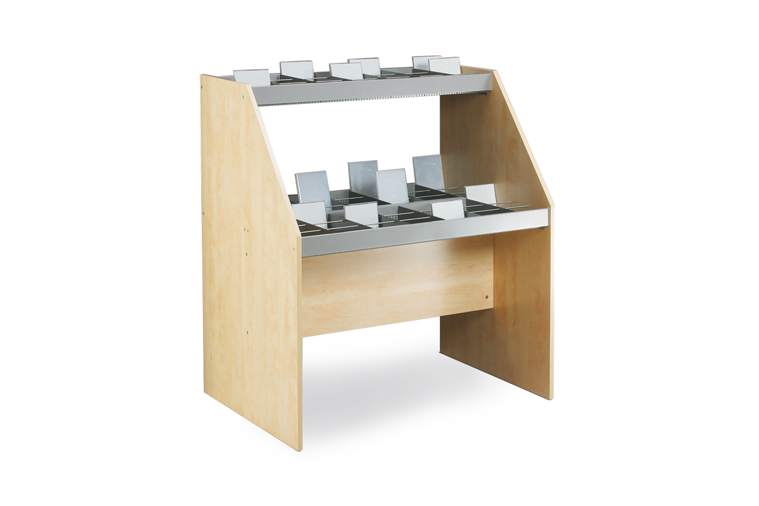 Het meubel is ook uitgerust met horizontale stangen en 6, 12 of 18 metalen verdelers afhankelijk van het model. Het bevat ook gegroefde rubber matten die de media rechtop houden.