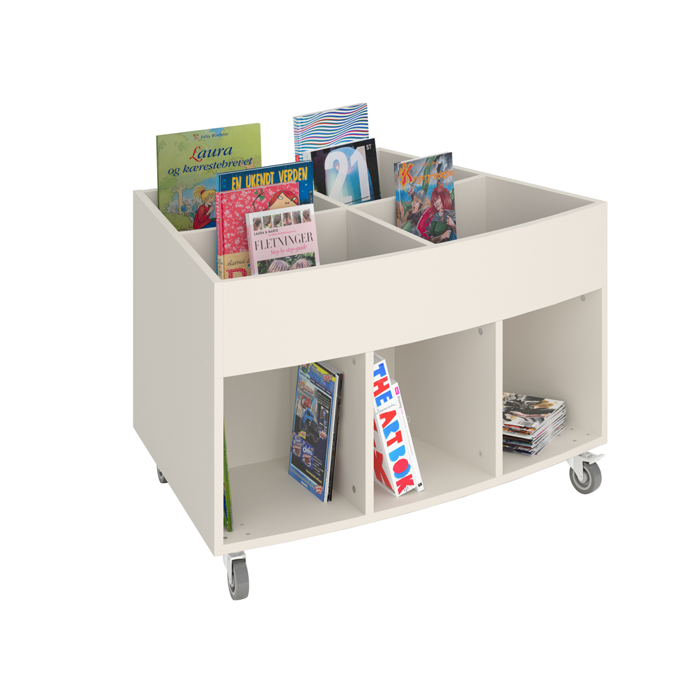 Sara Midi is een prentenboekenbak met vier displaycompartimenten bovenaan en vier opbergcompartimenten onderaan. Geschikt voor kinderen.