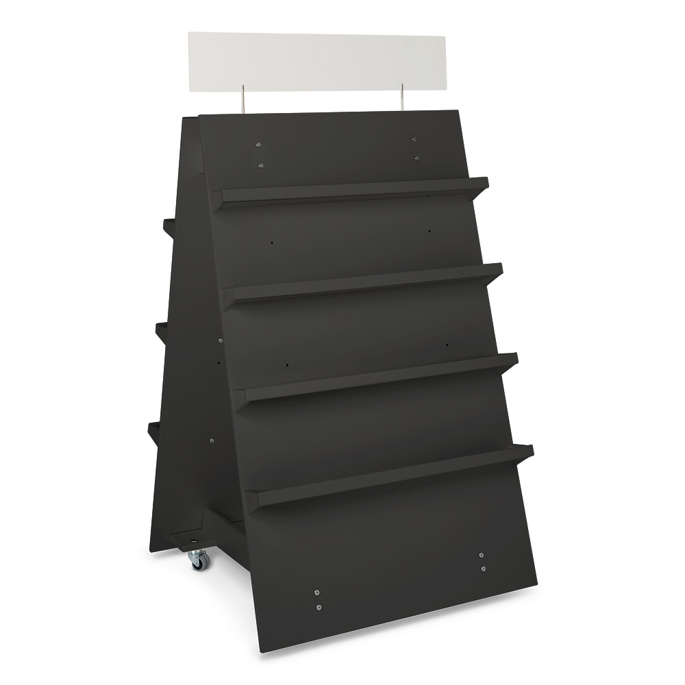 Verschillende mediaformaten kunnen op deze display gepresenteerd worden dankzij de verstelbare planken. Gebruik 3 of 4 planken aan elke zijde.