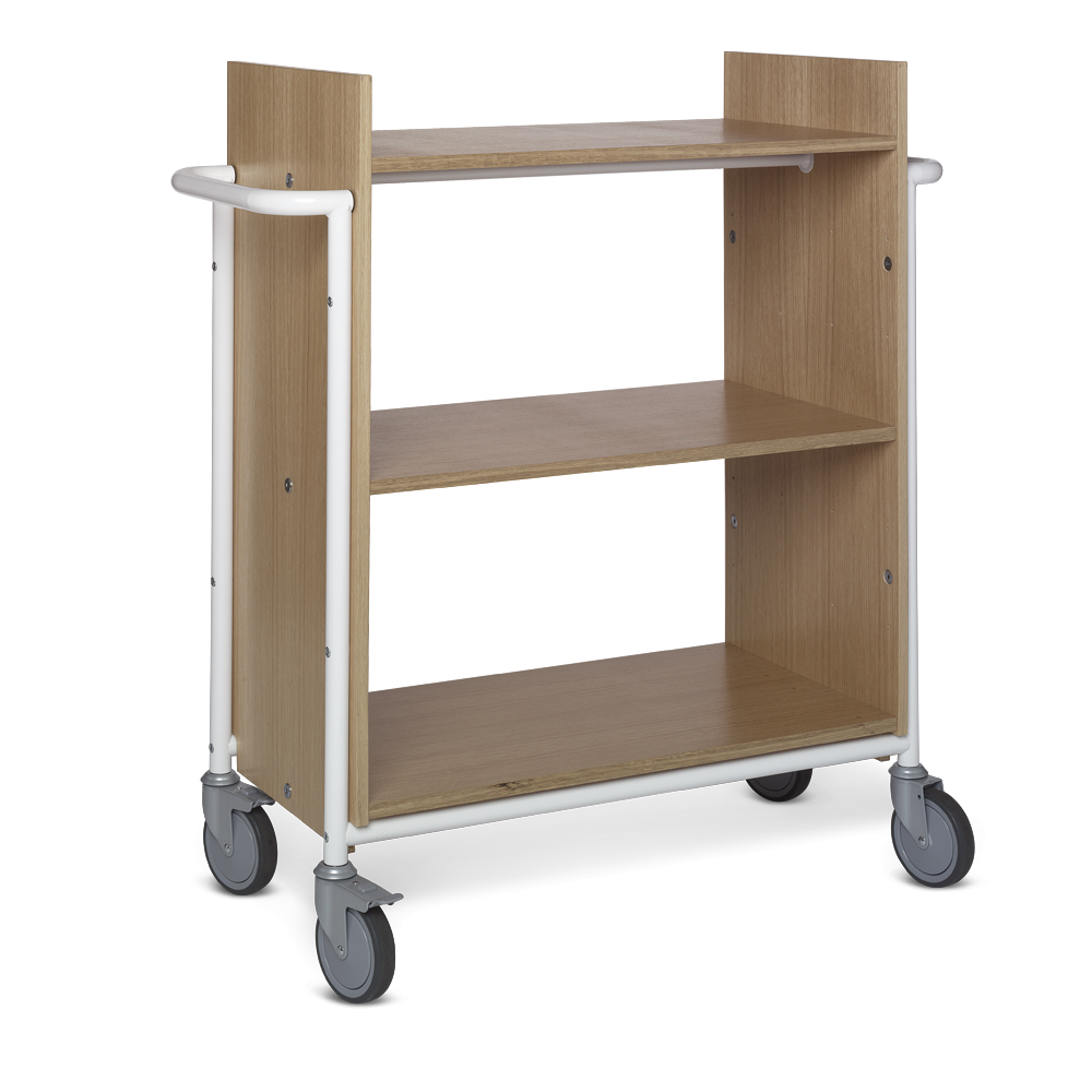 Dubbelzijdige boekenwagen met drie, veel plaats biedende, vlakke legborden.