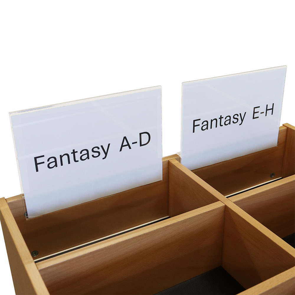 Dubbelzijdige display in acryl voor effectieve, nauwkeurige bewegwijzering op boekenwagens, boekenbakken, enz.